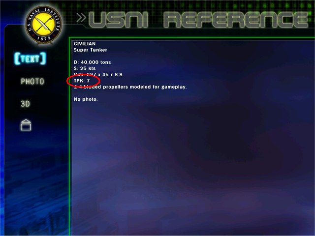 In der USNI-Datenbank finden Sie zu jedem Schiff den Eintrag "TPK:", der angibt, wie viele "turns per knots" (Umdrehungen pro Knoten), die Schraube macht. Merken Sie sich den Wert (in diesem Fall 7)!