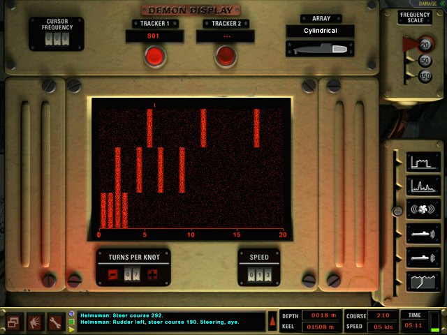 Nehmen Sie an, Ihnen ist bekannt, wie schnell sich ein Schiff bei einer bestimmten Schraubendrehzahl bewegt. Die Umdrehungsgeschwindigkeit der Schrauben ließe sich dann einfach in die Schiffsgeschwindigkeit umrechnen, richtig? Nur, von wem erfahren Sie, wie häufig sich die Schrauben eines Kontakts drehen? Von Ihrem Demon. Das ist kein Hausgeist auf Ihrem Boot, sondern steht für "Demodulated Noise" und bedeutet nichts anderes, als dass die Frequenzen der Schraubengeräusche eines Kontakts analysiert werden, um die Umdrehungsgeschwindigkeit zu ermitteln.
