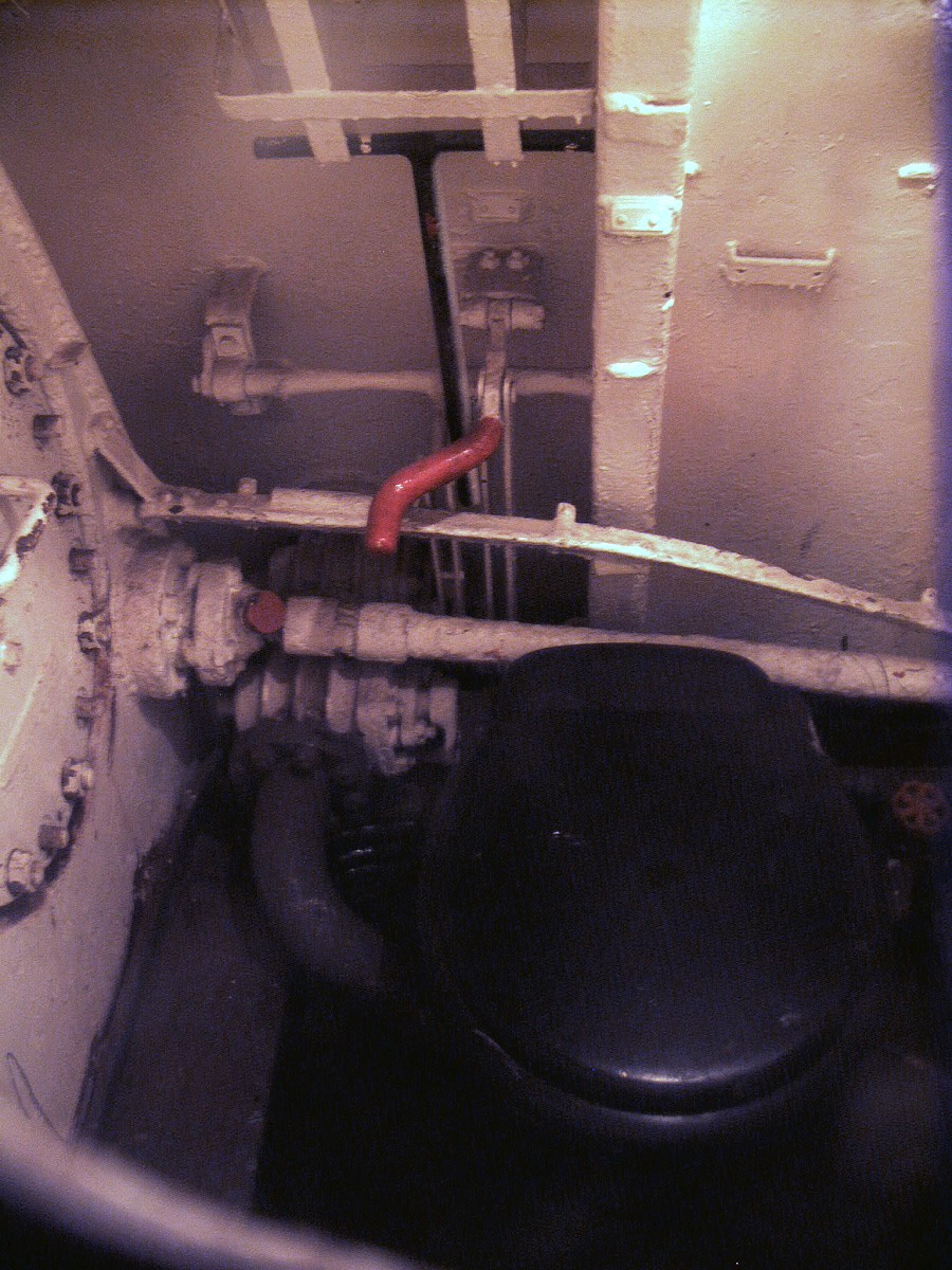 An Bord gab es zwei WC, die bis zu einer Tauchtiefe von ca. 20 Metern benutzt werden konnten. Das hier gezeigte WC lag gegenüber der Kombüse und wurde als zusätzlicher Stauraum für Proviant genutzt, sodass der ca. 50 Mann starken Besatzung nur das im vorderen Bereich gelegene WC blieb. |