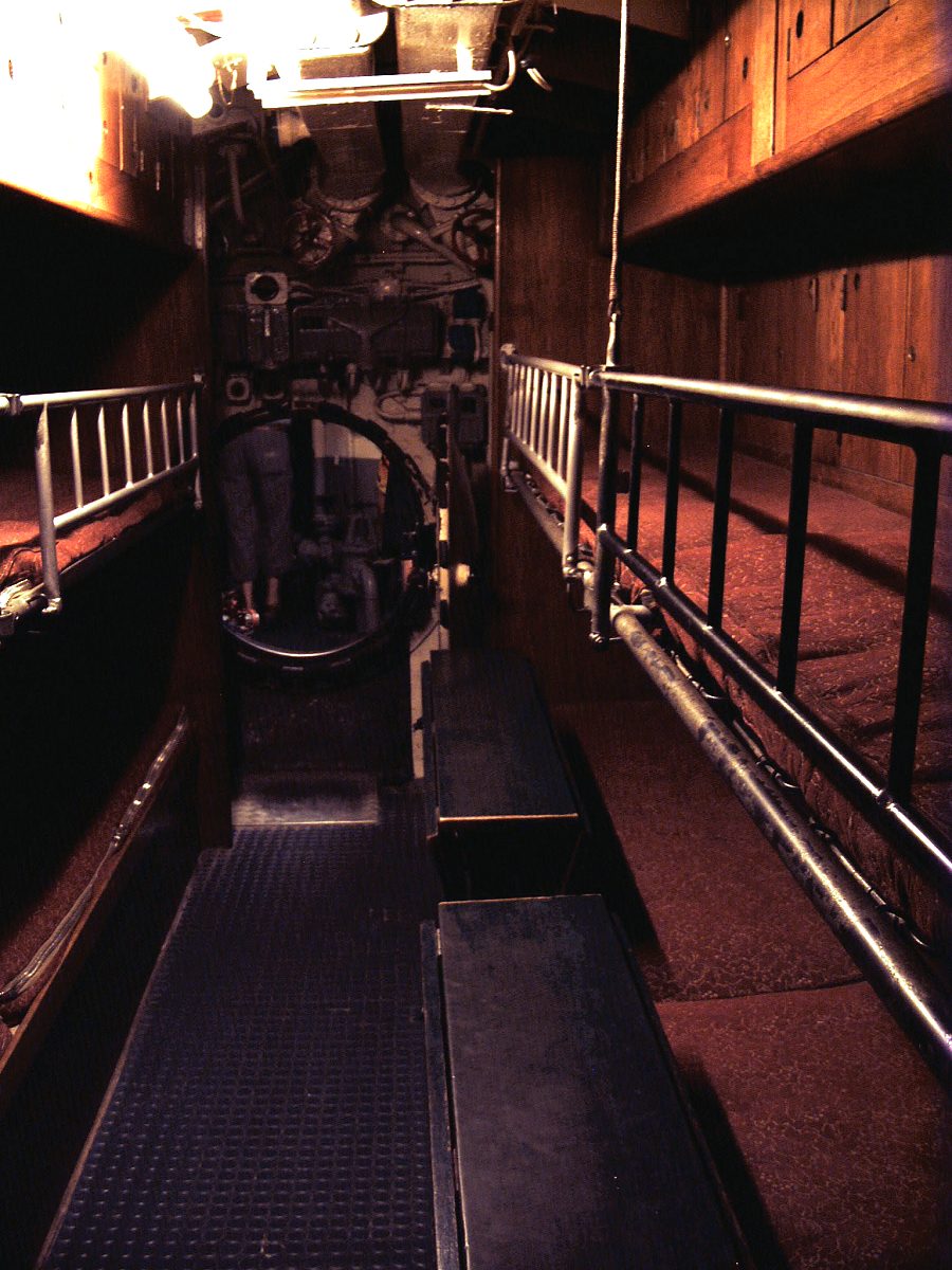 Im U-Raum, der sich hinter der Kombüse und vor der Zentrale befindet, schliefen die Unteroffiziere (Maate und Obermaate). Je zwei Besatzungsmitglieder teilten sich eine Koje. Die Tische konnten zum Essen hochgeklappt werden - dann verblieb jedoch kaum noch Platz im Durchgang. Unter den Flurplatten befand sich ein Teil der Batterieräume. |