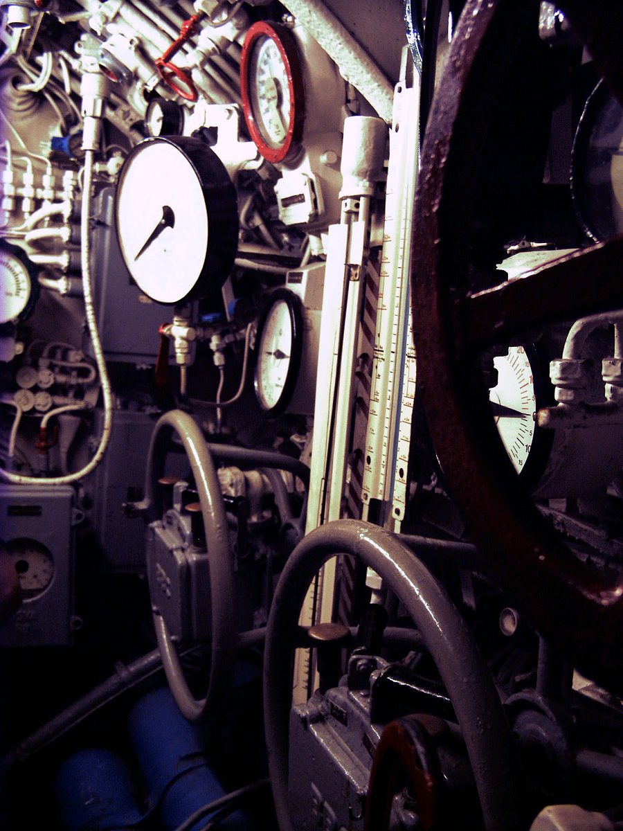 Auf der Steuerbordseite der vorderen Zentrale saßen die Rudergänger für die Steuerung des vorderen und hinteren Tiefenruders. Auch dieses wurde hydraulisch bedient und konnte im Notfall über die beiden großen Handräder manuell gesteuert werden. Zwischen beiden Handrädern ist der so genannte "Papenberg" zu erkennen: mit Hilfe des senkrecht stehenden Instruments konnten die Tiefenrudergänger ablesen, wie weit das Periskop über die Wasseroberfläche hinausragte. Durch die Schwankungen der Wassersäule im Papenberg konnten sie früher und damit genauer auf ein Steigen oder Absinken reagieren, als das über den Tiefenmesser möglich gewesen wäre.