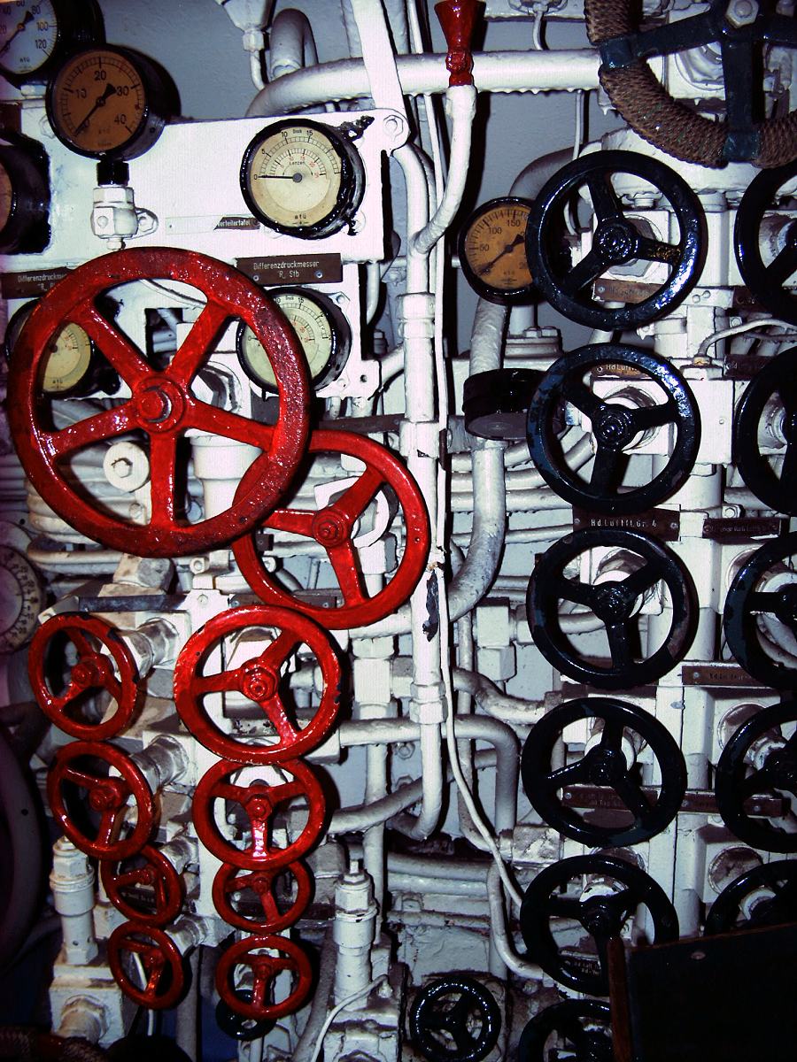 Über die zahlreichen Ventile wurde die Hoch- und Niederdruckluft gesteuert, mit der z. B. die Tauchtanks ausgeblasen werden konnten. Die Handräder sind je nach Lage der Tanks (Steuerbord/Backbord) unterschiedlich farbig gekennzeichnet. |