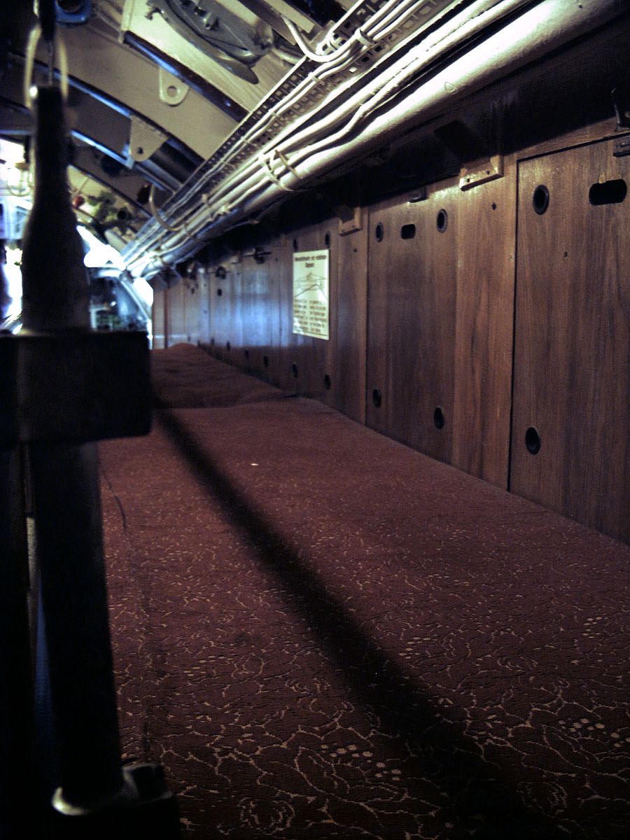 Auf dem Foto sind die doppelstöckigen Kojen auf der Steuerbordseite zu sehen. Der Großteil der Besatzung war hier untergebracht. Besonders zu Beginn einer Fahrt herrschte drangvolle Enge, da die Kojen nicht nur doppelt belegt waren, sondern auch noch zusätzlich Proviant und Reservetorpedos im Bugraum und unter den Flurplatten mitgeführt wurden. Während der täglichen Wartung der Torpedos, mussten die Kojen außerdem zur Wand hin hochgeklappt werden. |