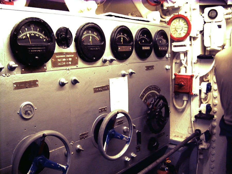 Rechter Teil der Backbord-Schalttafel - die E-Maschine diente über Wasser zugleich als Generator, um die Batterien aufzuladen. Sie wurde in diesem Fall auf die Schraubenwelle gekuppelt und von den davor liegenden Dieselmaschinen angetrieben. Die Ladespannung konnte über die rechte Seite der Schalttafel gesteuert werden. |