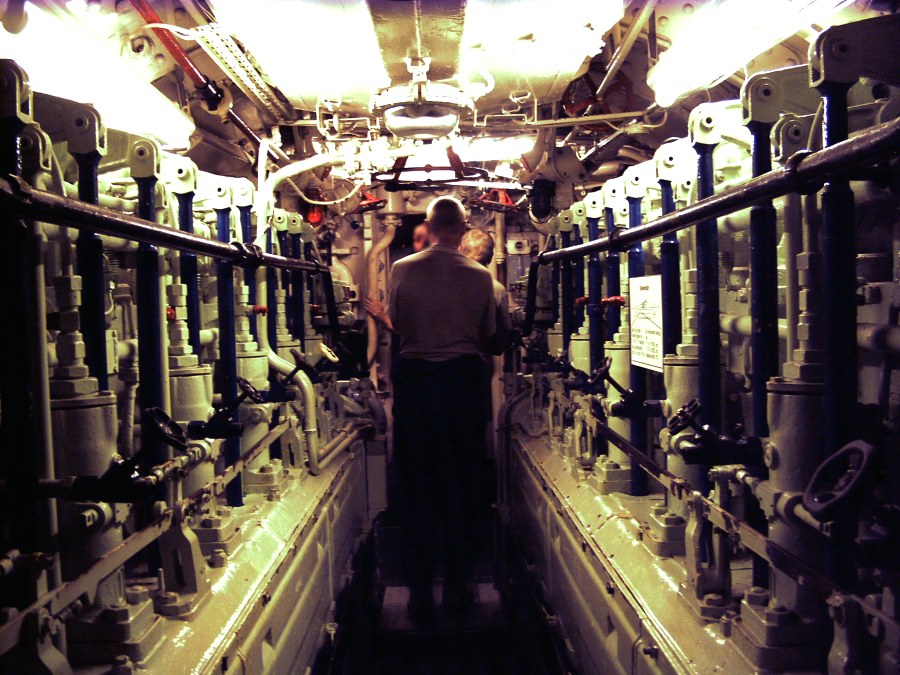 Blick in den Dieselmaschinenraum. Die zwei 6-Zylinder-Diesel mit je 1400 PS brachten das U-Boot aufgetaucht bis auf 17 Knoten (ca. 31 km/h). Die Reichweite betrug bei 10 kn ca. 7900 Seemeilen (ca. 14.600 km); bei Höchstfahrt von 17 kn jedoch nur 3250 Seemeilen. |