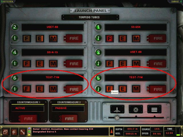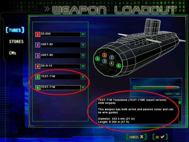 Die Kilo-Klasse kann nur in den äußeren Torpedorohren 5 + 6 drahtgelenkte Torpedos mitführen ("TEST-71M"). Wählen Sie diese daher aus.