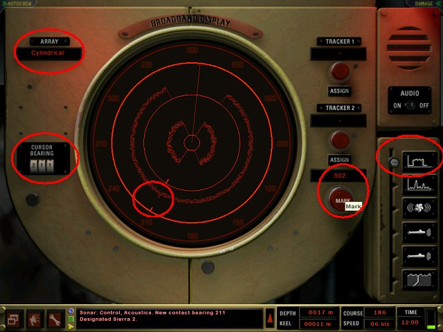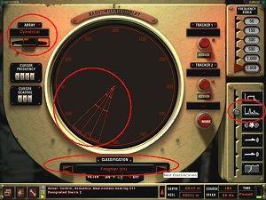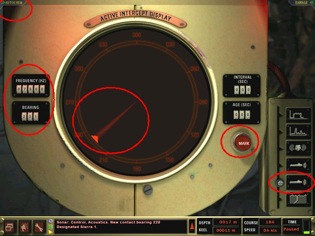 In der Sonarstation angekommen, bewegen Sie den Schiebeschalter unten rechts auf die zweite Position von unten - Sie rufen damit die passive Sonarortung auf ("Active Intercept Display"). Bewegen Sie das rote Dreieck mit der Maus (linke Maustaste gedrückt halten) so, dass die Spitze mit der Ortung übereinstimmt (siehe Bild).
