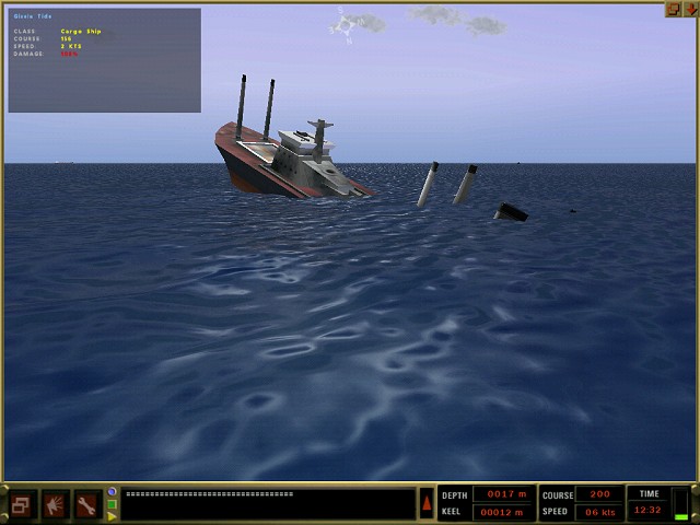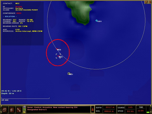 Ergebnis: Sie hören aus der Richtung, aus der Sie ein aktives Sonarsignal empfangen haben, die Geräusche eines Frachters oder Tankers. Diese Schiffe verfügen jedoch nicht über aktive Sonaranlagen! Damit liegt die Vermutung nahe, dass ein Frachter oder Tanker von einer Überwassereinheit in Richtung 230 Grad begleitet wird. Die Überwassereinheit können Sie noch nicht hören, da Handelsschiffe in der Regel lauter sind als Marineeinheiten. Damit kombinieren Sie messerscharf, dass es sich bei dem passiven Sonarkontakt nicht um einen Tanker, sondern um das im Missions-Briefing genannten Zielschiff, den Frachter, handelt!