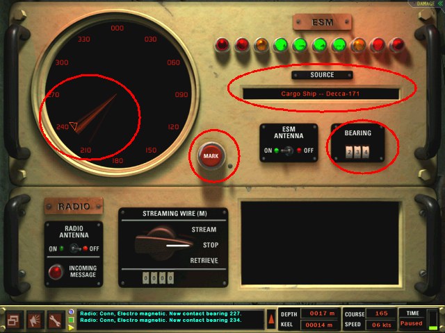 Die "ESM"-Station im oberen Teil des Bildes dient dazu, Radarortungen anderer Einheiten zu entdecken und zu identifizieren. Sie stellen also ähnlich wie bei der Sonarortung durch Analyse der Frequenzen fest, um was für ein Radarsystem und damit um was für eine Einheit es sich handelt. Außerdem können Sie die Richtung und Stärke des Signals messen! Letztere gibt Ihnen einen vagen Anhaltspunkt, wie weit der Kontakt entfernt sein könnte.