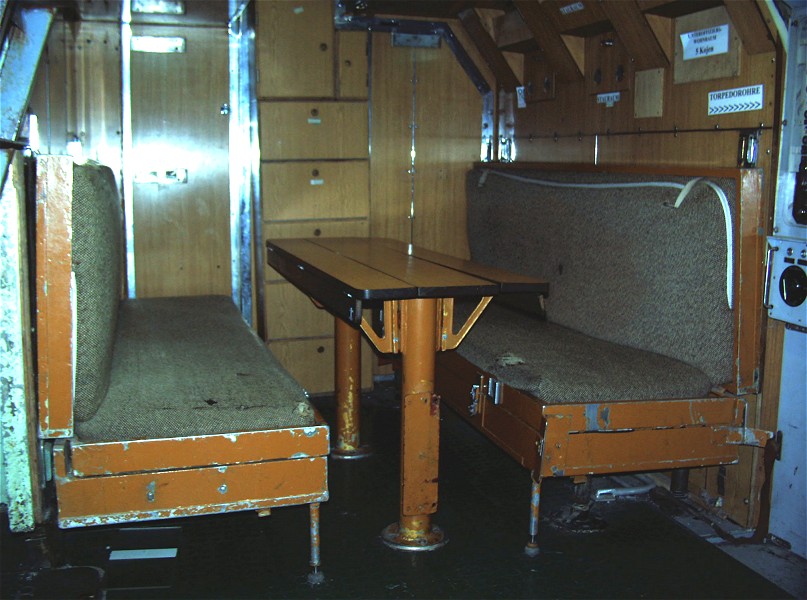Die Kojen für die Mannschaft und Unteroffiziere liegen im Bugtorpedoraum, direkt gegenüber den Torpedorohren. Bei der Besatzung heißt die gezeigte Messe auch "Ums Eck". Für den Fall, dass die Torpedos zur Wartung aus den Rohren geholt wurden, mussten die Bänke/Kojen hochgeklappt werden.