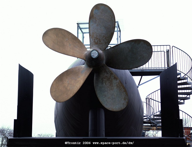 | Der fünfflügelige Propeller wurde in ganz ähnlicher Form auch bei der Klasse 201 eingesetzt. Ziel bei der Konstruktion ist ein möglichst geräuscharmer Antrieb, der durch eine vielflügelige und große Schraube mit langsamer Drehzahl sichergestellt wird. Bei modernen U-Booten wird ein weiterentwickelter, sichelförmiger Propeller verwendet, bei dem auch bei höheren Fahrtstufen weniger Verwirbelungen im Wasser (und damit weniger Geräusche) entstehen. |