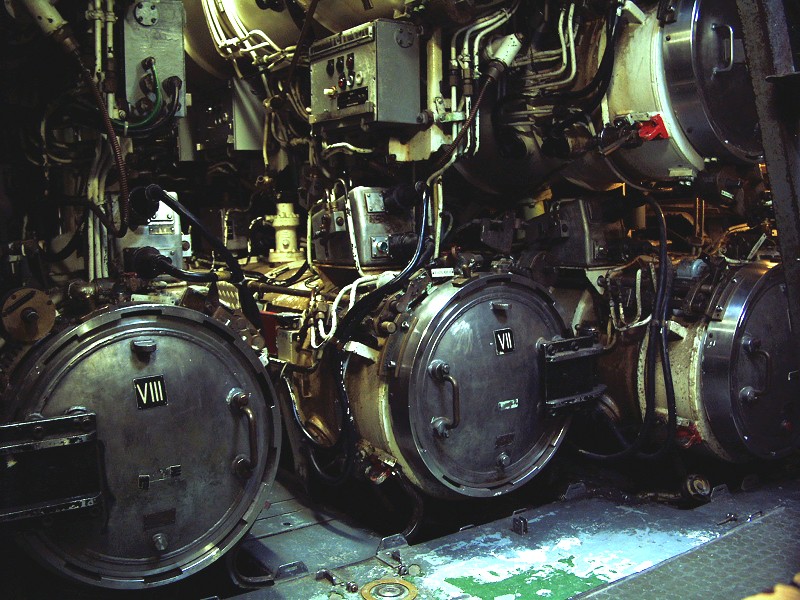 Der Torpedoraum diente zugleich als Unterkunft (nicht im Bild) für Mannschaft und Unteroffiziere. Die Bewaffnung von insgesamt acht Torpedos wurde komplett in den Rohren mitgeführt. Die beengten Raumverhältnisse ließen extern gelagerte Torpedos nicht zu. Auf dem Boden zwischen Rohr VII und VIII ist ein runder, messingfarbender Anschluss zu sehen, der zu den Batterien unter dem Bugraum führt. Weitere Details auf dem nächsten Foto ... |