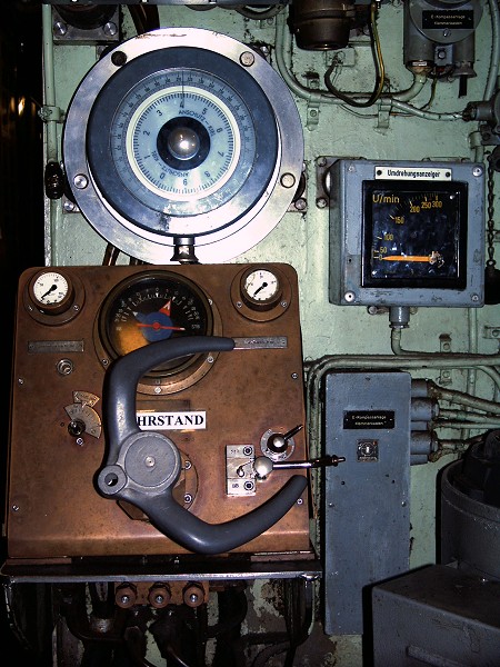 | Der Fahrstand ist vorne in der Zentrale auf der Steuerbordseite mit Blick zum Bug angeordnet. Oben im Bild befindet sich der Kompass, auf der schwarzen Anzeige darunter konnte der Ruderstand abgelesen werden und die quadratische Anzeige rechts gab die Umdrehungsgeschwindigkeit der Schraubenwelle an. |